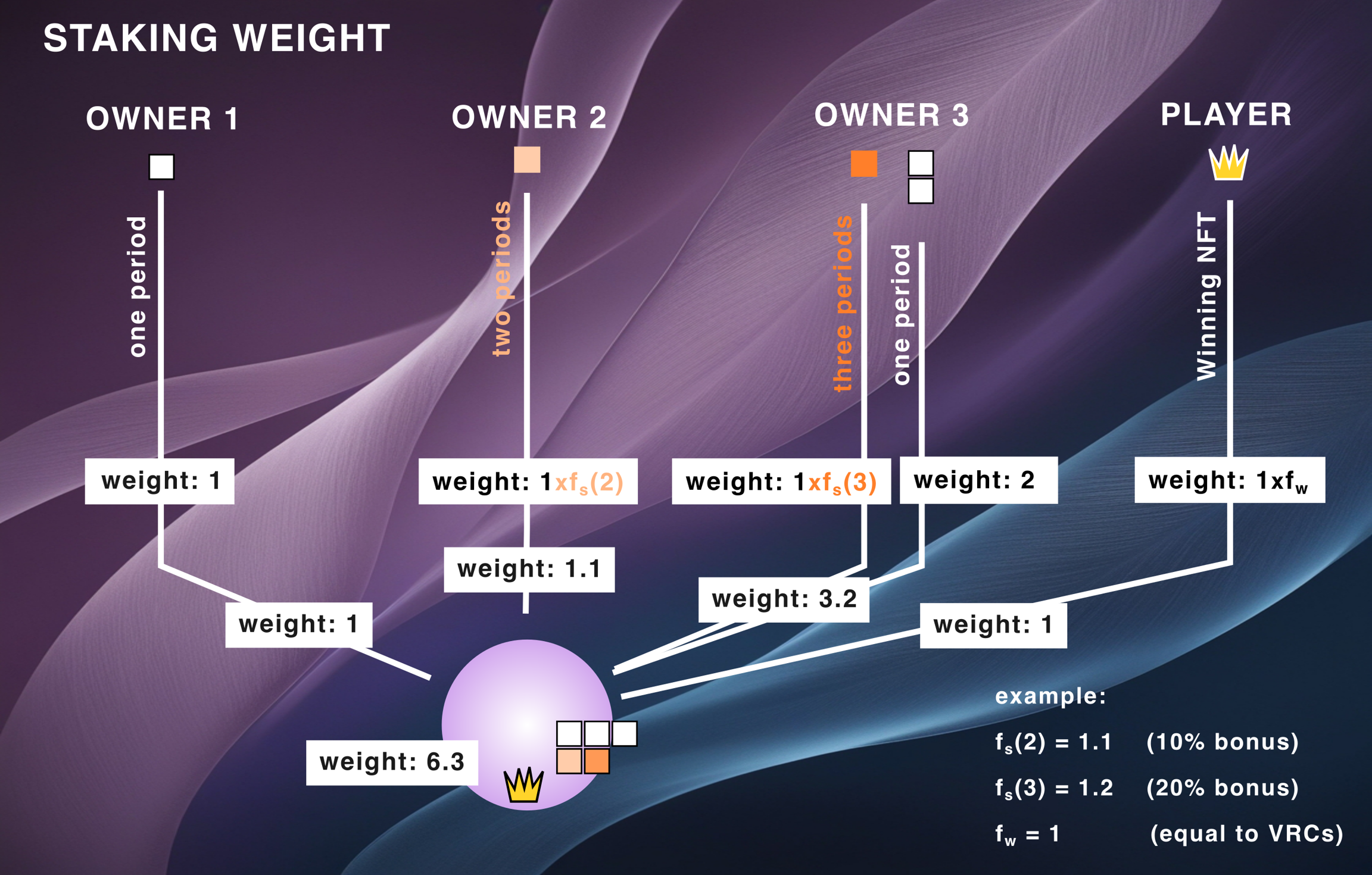The Staking Weight of each game or experience is calculated from all stakes placed on it. A VRC staked for a single period adds a base Weight of 1. If it is staked for multiple staking periods, it adds an higher value to the Weight. The exact value is determined by a custom Staking Function f_s(#Periods, #VRCs, ...), which is always larger than 1. The Staking Function depends on factors such as the number of staking periods, the quantity of VRCs staked simultaneously, and other criteria that may evolve over time. Similarly, the Weight of Winning NFTs is governed by another function f_w - the so called Winning Function. Both the Staking and Winning functions are designed to adapt dynamically in response to community feedback and the evolving needs of the Crafti ecosystem.