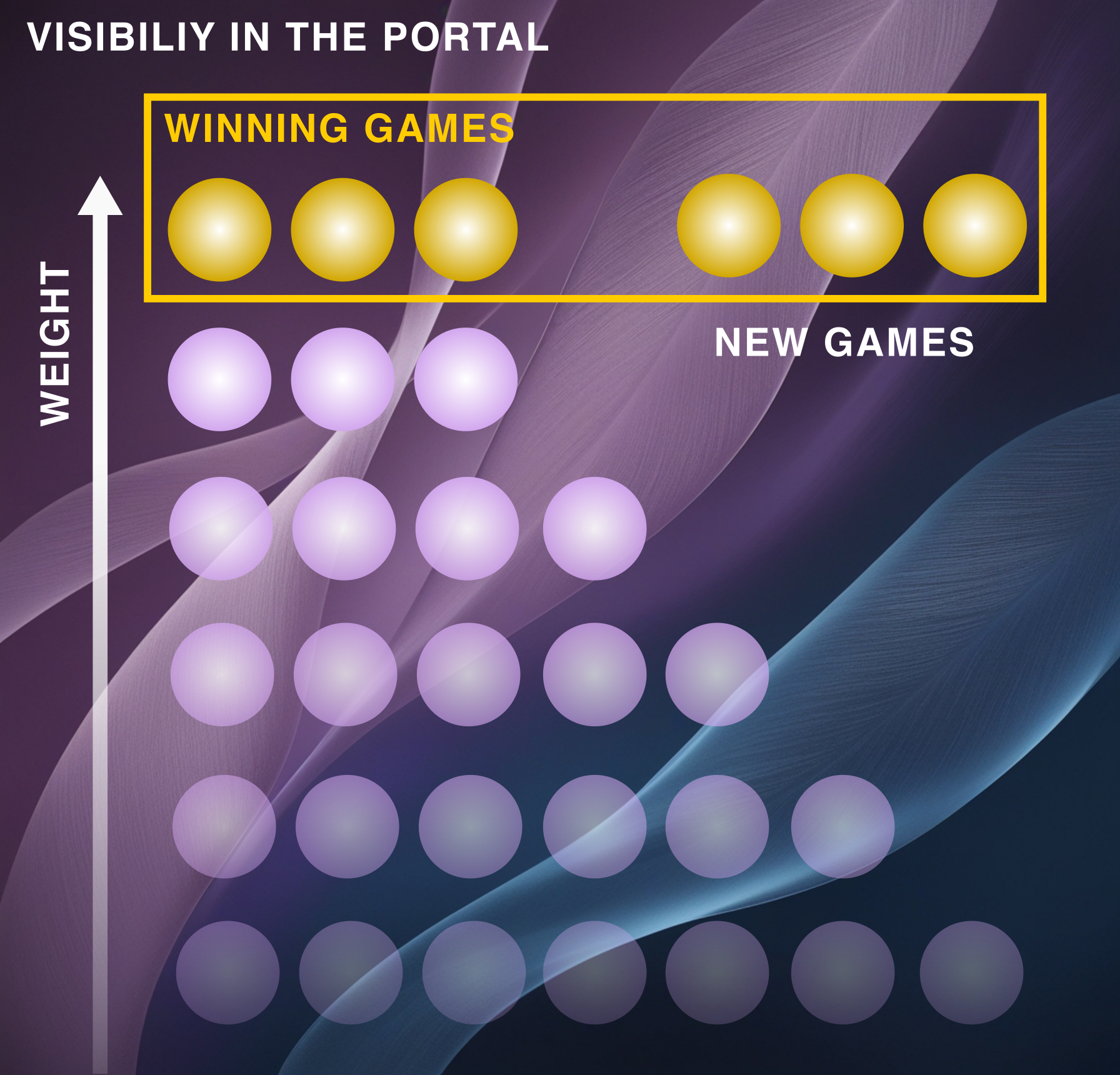 To enhance their visibility ranking, games and experiences compete for the stakes of both Owners (VRC NFTs) and Players (Winning NFTs). Each staking period begins with a visibility ranking determined by the Staking Weight assigned to each game, based on the total stakes it receives. This weight influences the game’s position within Craftiverse. For each staking period the Staking Weight, and thus the game's position, may change, allowing titles to evolve dynamically and potentially advance toward high-traffic “hotspots” within the Portal.